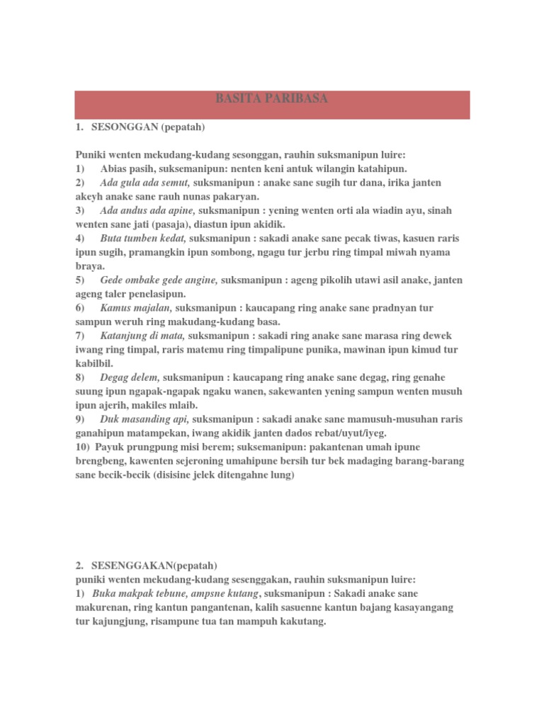 Satua bali i lara. Sesimbing Sindiran Sesimbing punika kruna ucapan pepiring sane pades suksmanipun mawinan sang kasimbing jengah wiadin sebet riantuk ngrasa ring dewek katiben sesimbing. Sesawangan Perumpamaan Sesawangan lingganipun sawang mateges mirib polih pangiring an lan kadwipurwayang dados sesawangan.