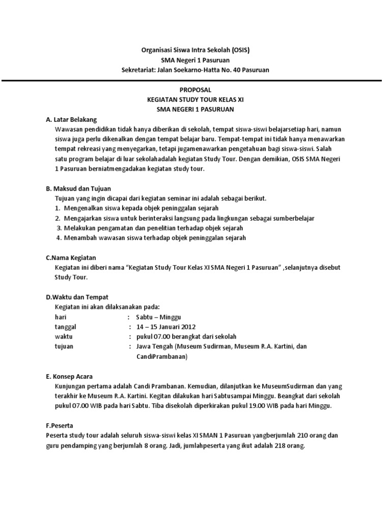 Proposal Kegiatan PROPOSAL KEGIATAN STUDY TOUR KE JAWA TIMUR AKSELERASI ANGKATAN 8 DAN 9 A. Contoh Proposal Study Tour Mahasiswa D49ogwmvr649. Latar Belakang Latar Belakang kemajuan yang terjadi dalam berbagai bidang kehidupan memberikan pengaruh yang cukup besar dalam bidang pendidikan.