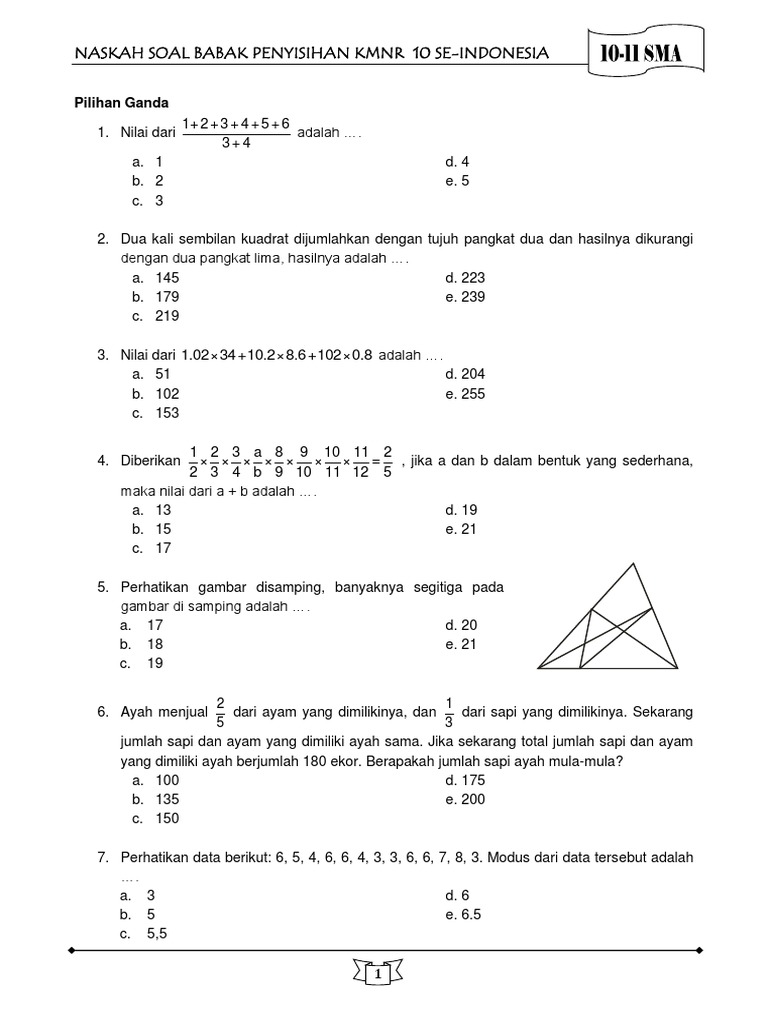 Oleh gurusd Diposting pada 13 Juni 2020. Siswa yang terdaftar pada lampiran dapat mengikuti seleksi babak penyisihan Kompetisi Matematika Nalaria Realistik KMNR Ke-13 yang akan dilaksanakan pada. Soal Penyisihan Kmnr 10 Kelas 5-6 d47ezywj1yn2.